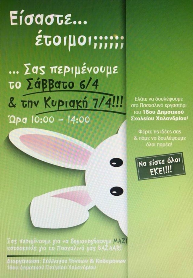 Για την προετοιμασία των κατασκευών θα γίνει Πασχαλινό Εργαστήρι το Σάββατο 06.04 και την Κυριακή 07.04 και ώρες 10πμ-2μμ στον χώρο του σχολείου!