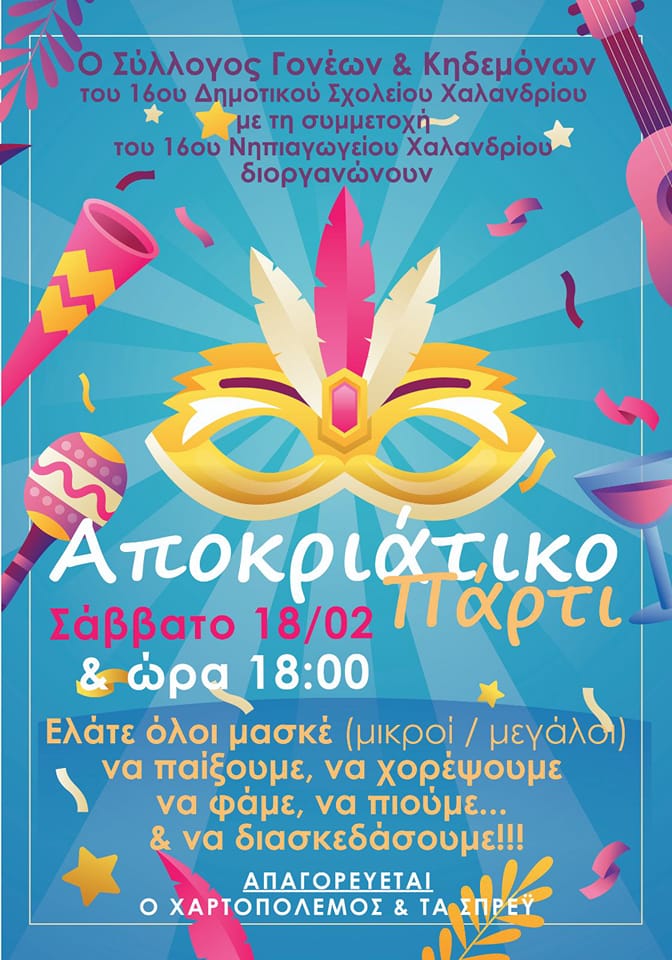 Σημειώστε τη μέρα και την ώρα! Σάββατο 18-02 στις 18:00, μεταμφιεστείτε και ελάτε να διασκεδάσουμε στο 16ο!