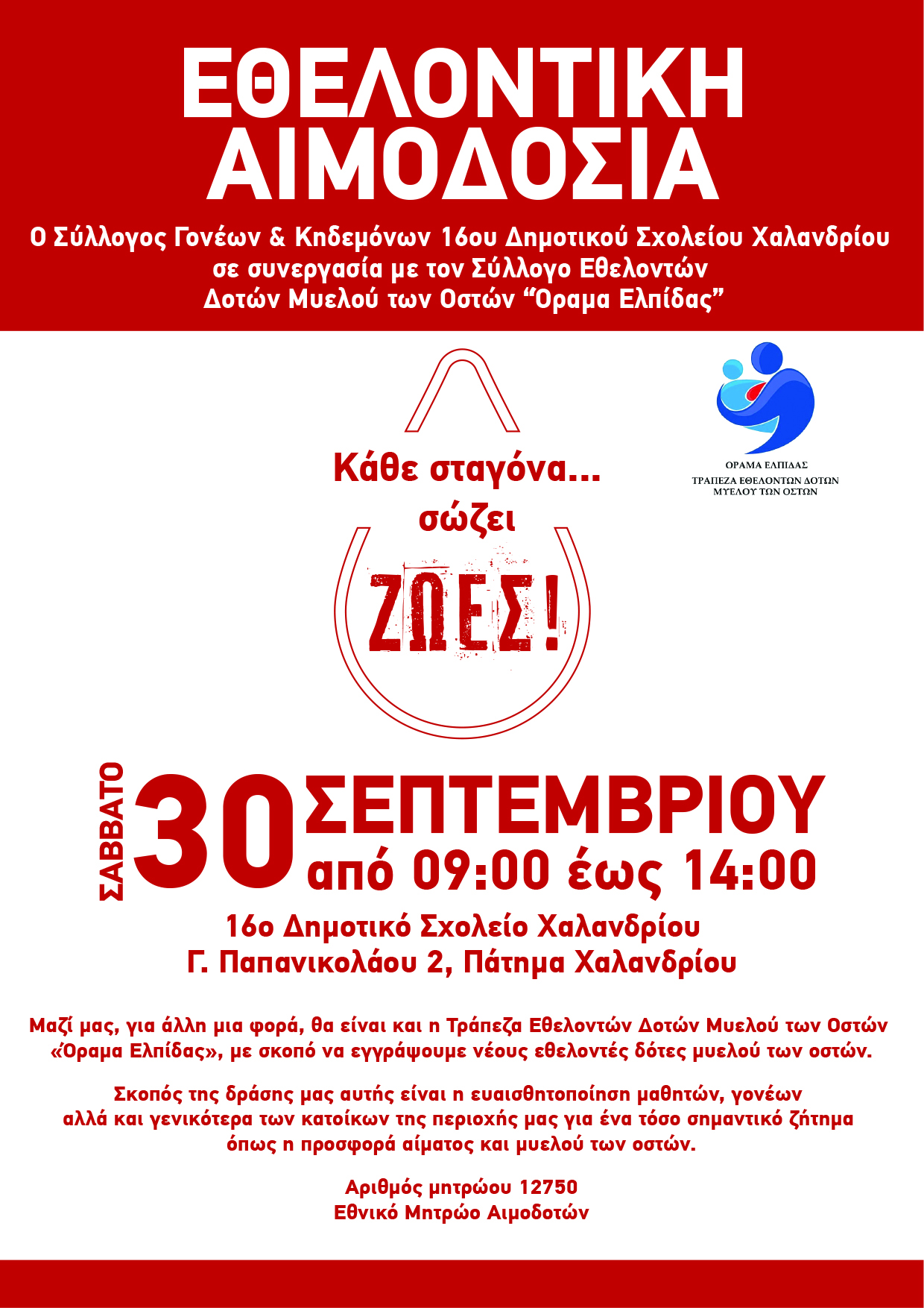 Σας περιμένουμε όλες και όλους το Σάββατο 30 Σεπτεμβρίου από τις 9:00 το πρωί έως τις 14:00 το μεσημέρι στην αίθουσα εκδηλώσεων του σχολείου μας (είσοδος από Παπανικολάου 2) για εθελοντική αιμοδοσία.