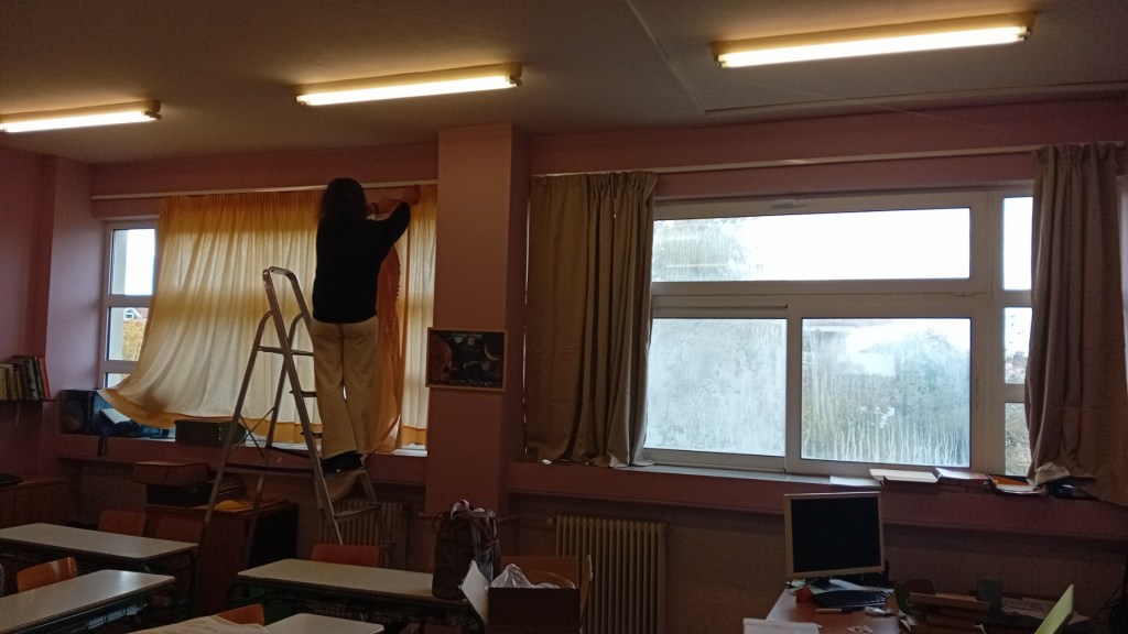 Ξεκίνησε σήμερα η αντικατάσταση των κουρτινών των τάξεων του σχολείου από κουρτίνες σκίασης. Στόχος είναι να περιοριστεί το φως που μπαίνει από τα παράθυρα, έτσι ώστε να φαίνονται καλύτερα όσα προβάλλουν οι εκπαιδευτικοί σε διαδραστικούς πίνακες ή μέσω προτζέκτορα.